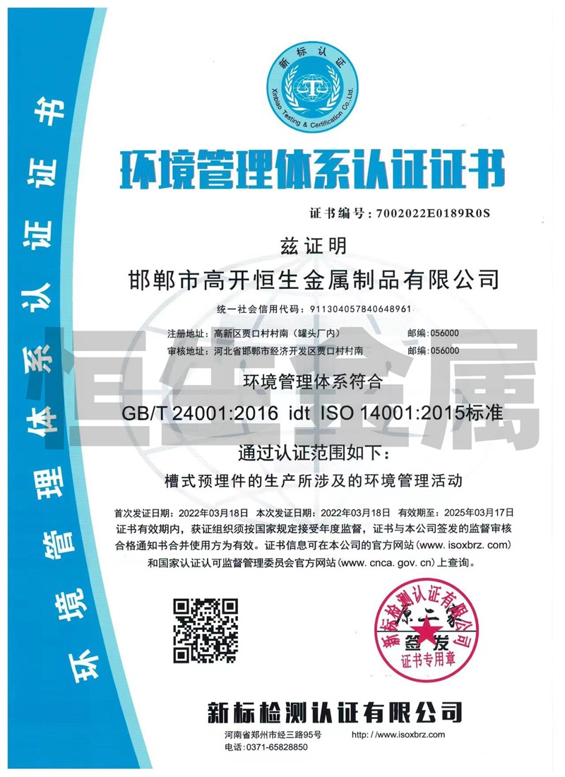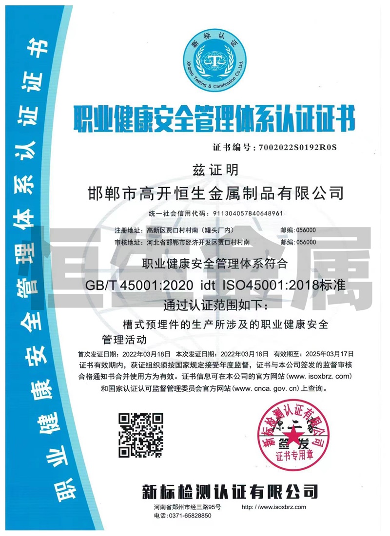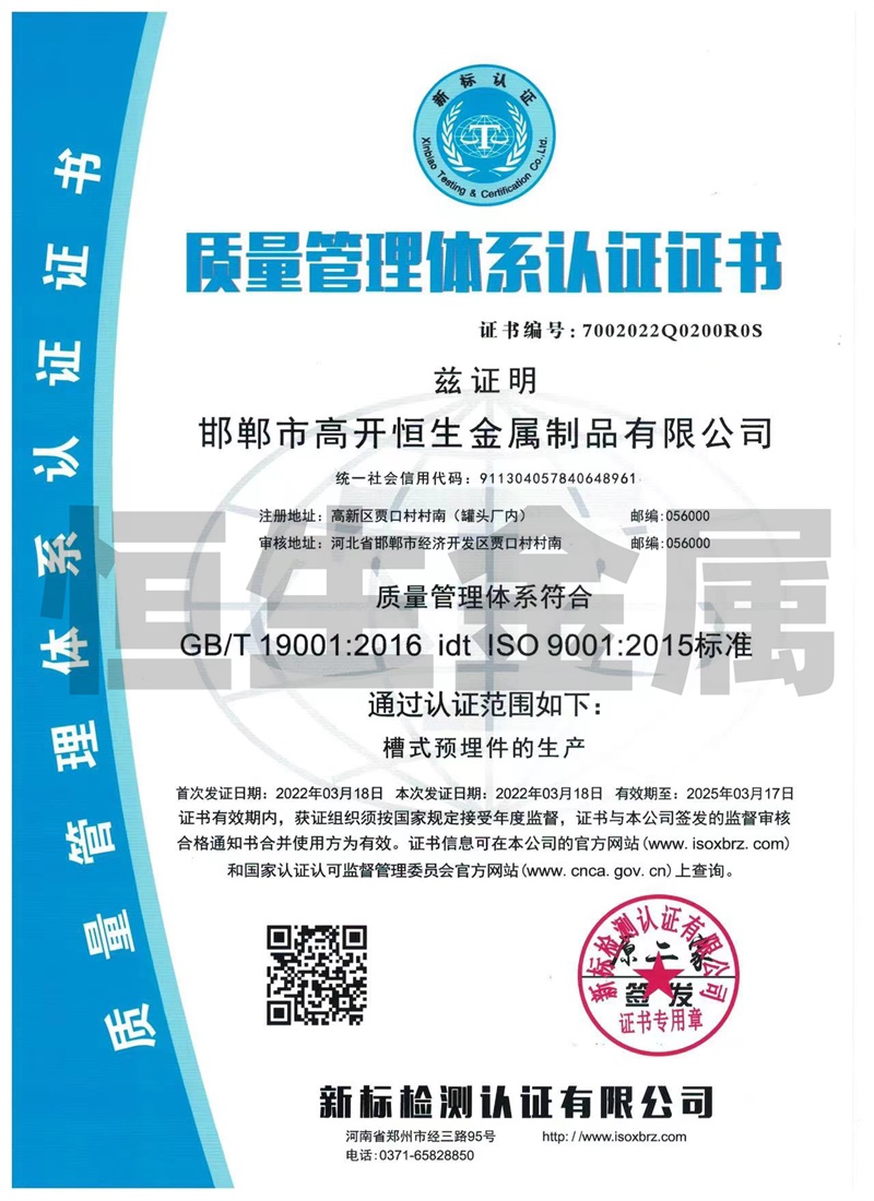 邯鄲市高開恒生金屬制品有限公司總部設在鋼城河北邯鄲,西鄰京廣線、東臨京深高速,地理位置優(yōu)越,交通比較便利。 我廠擁有多年生產預埋槽道的產品生產經驗,專業(yè)生產鍍鋅防腐槽型預埋件系列產品,其中產品包括:高開恒生哈芬槽、哈芬槽鋼、預埋槽道、預埋滑槽、帶齒預埋槽鋼、槽式預埋件、工字鋼材料、C型槽材料配套的T型螺栓,也可根據(jù)客戶需求按圖訂做加工,產品廣泛應用于隧道、城市軌道交通、地下綜合管廊、建筑幕墻施工工程。